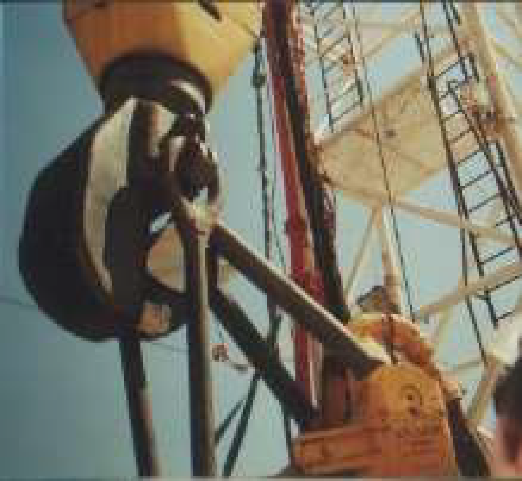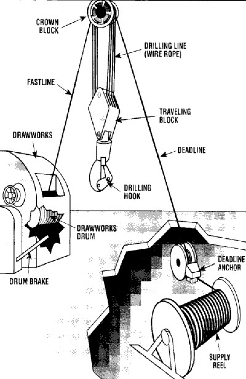 Taç ve hareketli bloklar, matkap çubuğunu yükselten ve indiren bir dizi makaradan oluşur.